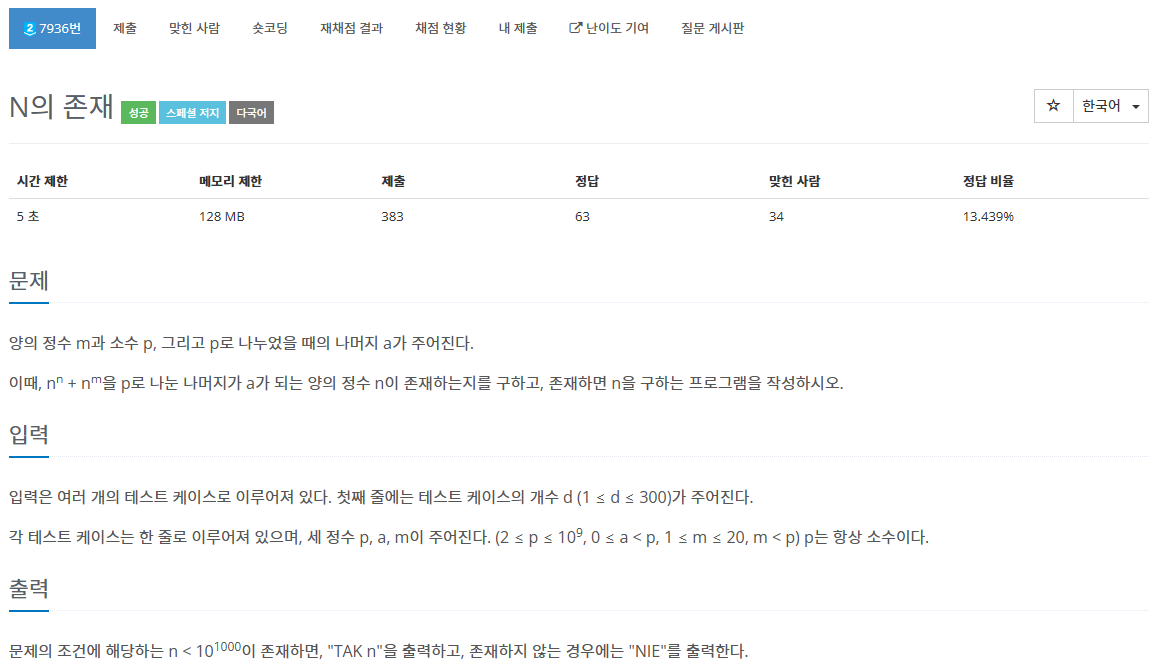 우선, 정수론적인 사전지식이 몇가지 필요하다. 원시근과 이산로그에 대해 알고 있다면 해당 문제의 풀이를 이해하는데에 지장이 없을 것이다. 만약 p에 대한 원시근을 하나 찾는다면 문제가 해결되었다고도 할 수 있다. n을 p씩 올리는 행동을 n^m 항에는 어떤 영행도 미치지 않지만, n^n항에서는 지수가 정확히 1 늘어난 효과를 보여준다. 따라서 원시근을 일단 찾고 나면, n^n === a-n^m(mod p)인 문제를 해결하게 된다. 이때 n을 p씩 늘린다고 하였기 때문에, 그 원시근을 거듭해서 곱해주는 효과가 나타난다. 이 방법을 통해 특정한 값에 도달할 수 있는가는 이산로그 문제를 해결함으로써 알아낼 수 있다. 이산로그 또한 baby step giant step을 통해 충분히 빠르게 해결할 수 있다는 사실이 이미 널리 알려져 있다.